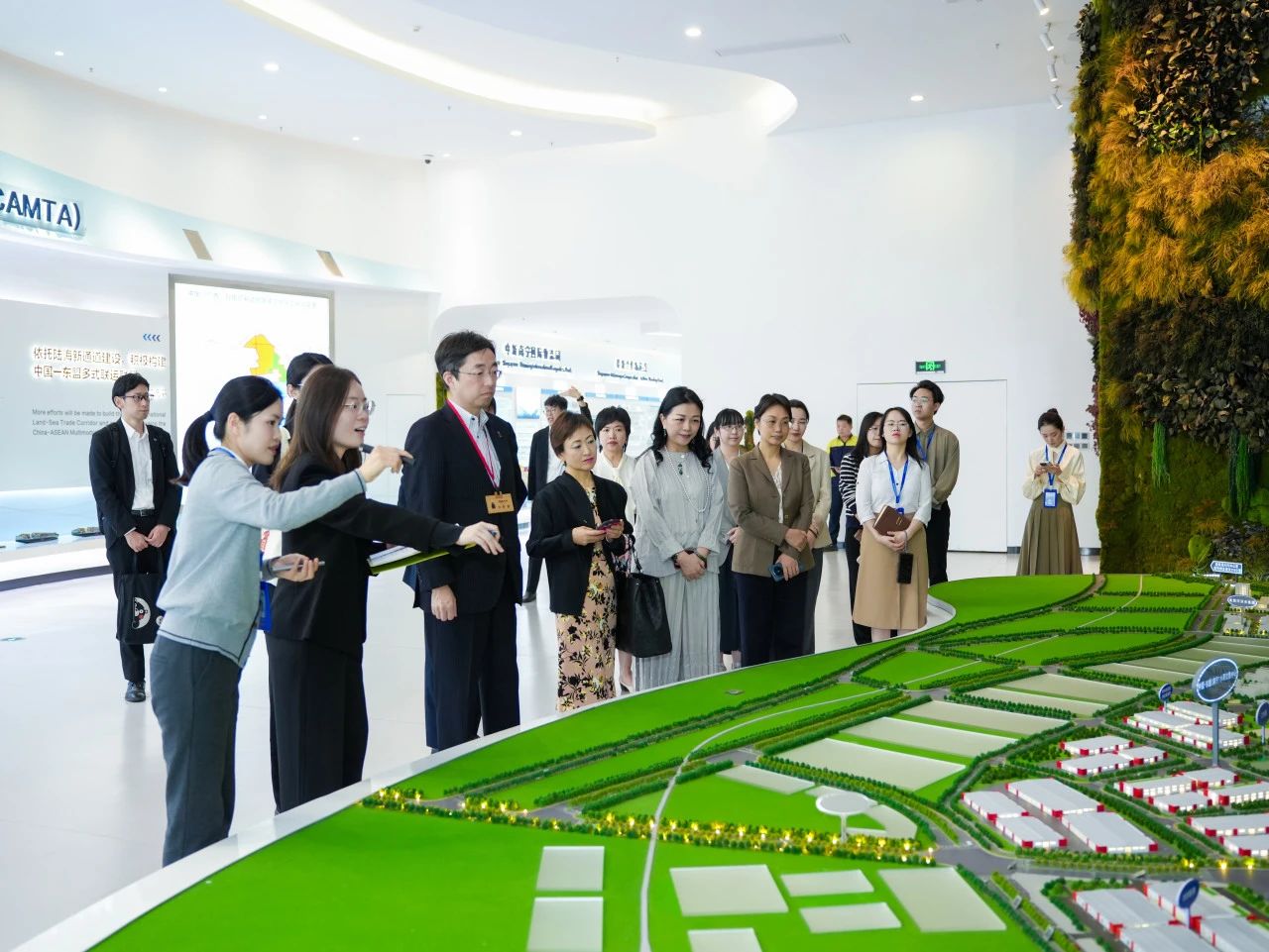 在中新物流園展廳,代表團(tuán)詳細(xì)了解園區(qū)的整體規(guī)劃和發(fā)展情況,對(duì)國(guó)際陸海貿(mào)易新通道的戰(zhàn)略價(jià)值以及廣西作為關(guān)鍵節(jié)點(diǎn)的樞紐作用有了更深刻的理解。代表團(tuán)對(duì)于園區(qū)選址于廣西南寧,既把握了中國(guó)西部大開(kāi)發(fā)的戰(zhàn)略機(jī)遇,又充分發(fā)揮了廣西面向東盟的區(qū)位優(yōu)勢(shì),實(shí)現(xiàn)多方共贏發(fā)展格局表示了贊賞。