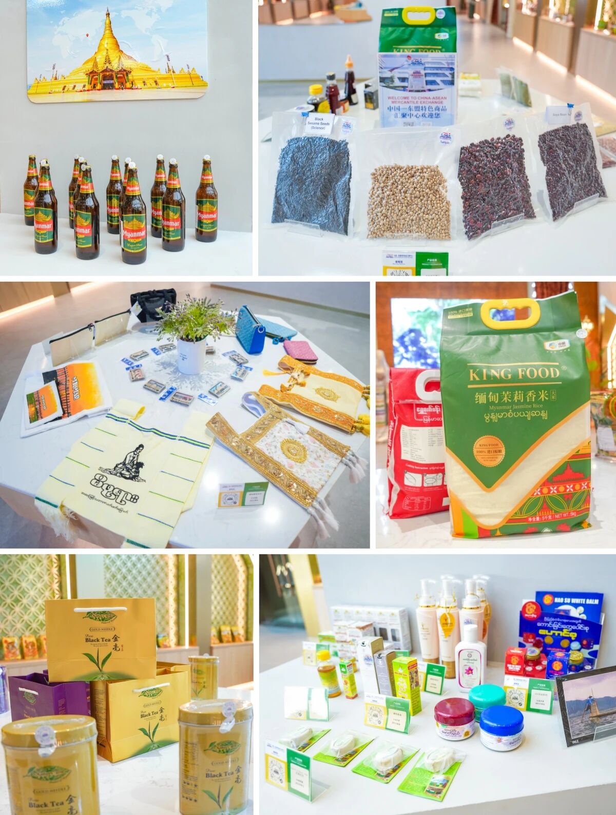 緬甸主題館內(nèi)展示了啤酒、茶葉、木偶奶茶、香米等多款特色商品,加之獨(dú)具當(dāng)?shù)靥厣恼故九_(tái),它們共同為我們打開了一扇感知緬甸民俗風(fēng)情的窗口。