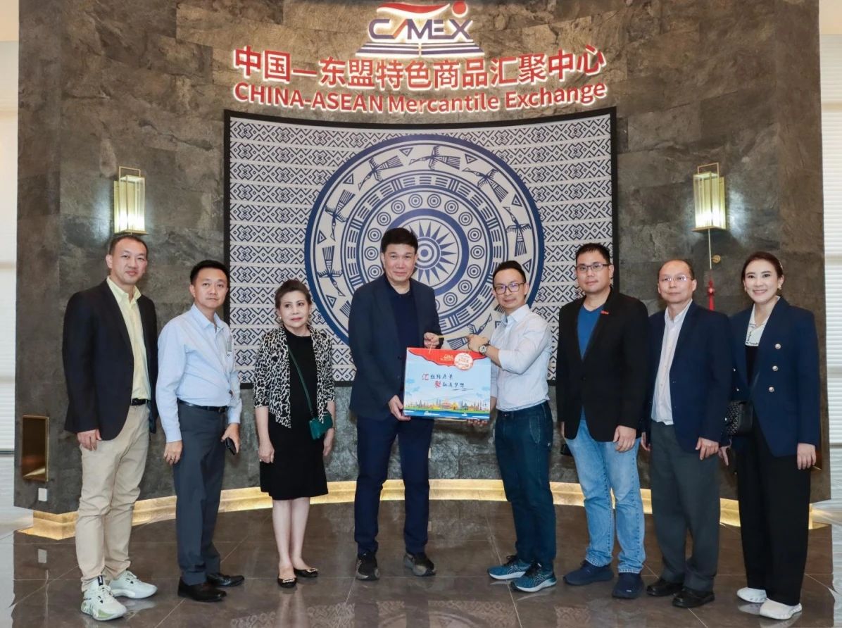 2024年6月6日,泰國工業(yè)聯(lián)合會副主席維迪·左瓦塔那率由泰國地方政府部門、商協(xié)會及企業(yè)家組成的考察團到中國—東盟特色商品匯聚中心(簡稱“匯聚中心”)參觀交流。中國—東盟特色商品匯聚中心總經(jīng)理林哲宇熱情接待了考察團一行。